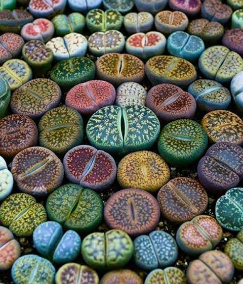 Nuestros protagonistas son plantas originarias de África austral. El género, Lithops, comprende 109 especies pertenecientes a la familia botánica Aizoaceae. Se conocen con los nombres comunes de piedras vivas, rocas vivas o plantas piedra ya que es precisamente eso lo que parecen: piedras que se encuentran en el desierto arenoso. También se les llama cactus piedra o cactus lithops, aunque no son cactus, sino suculentas no cactáceas.